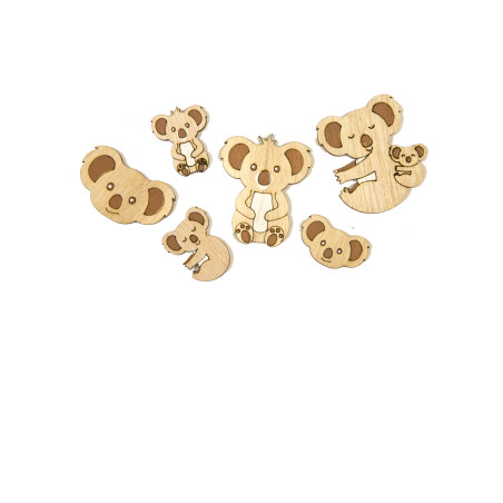 Fait de bois naturel en forme de Koala, différentes positions sont proposées pour ces 6 mignons confettis.