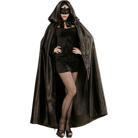 La cape à capuche noire satinée adulte est un accessoire conçu avec un tissu noir satiné, ce qui le rend doux au toucher. Elle mesure 152 cm de longueur et est large au niveau de la capuche, ce qui la rend plus bouffante sur les côtés. Le maintien de la cape se fait par un ruban qu’on attache autour du cou.