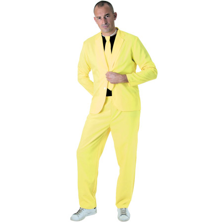 Le Costume fashion jaune fluo adulte est destiné aux hommes adultes. Il s’agit d’un ensemble composé d’une veste, d’un pantalon et d’une cravate. La veste se referme à l’avant avec deux boutons blancs.