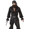 Ce superbe costume de Pirate en polyester contient une tunique noire imitation cuir à manches longues avec col et lacets et incorporé à la chemise, l'ensemble retenu à la taille par une magnifique ceinture avec bande imitation cuir noir et boucle argentée tête de mort et en dessous l'écharpe rayée noir et gris incorporée.