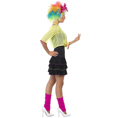L’effervescence des années 80 trouve son expression parfaite dans ce déguisement années 80 pop femme aux accents rétro et colorés. L’ensemble comprend une robe noire sans manches ornée de volants délicats soulignés de liserés fluo, ainsi qu’un haut jaune fluo transparent qui se porte par-dessus. Un serre-tête agrémenté d’un nœud rose complète la tenue avec une pointe de fantaisie.