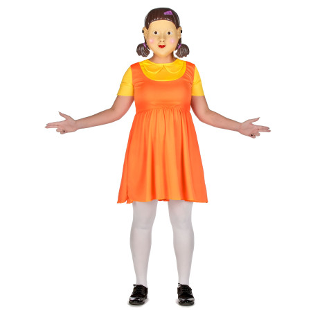 Nous vous proposons un costume de référence 79ML qui est fidèle à l’univers de la série coréenne Squid Game. Notre déguisement poupée tueuse femme est une robe mi-longue qui combine deux couleurs : l’orange et le jaune vif. Elle a des manches courtes et une longueur qui s’arrête au niveau des mollets. L’ensemble est complété par des chaussettes blanches.