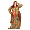 Le déguisement robe longue hippie à franges femme est une robe qui fait voyager dans le temps. Avec ses motifs colorés et ses manches longues et évasées, elle nous ramène tout droit dans les années 70. Le gilet marron cousu au-dessus de la robe ajoute un effet daim qui donne un look très hippie. Le collier en plastique jaune avec le symbole peace and love est le parfait complément pour ce déguisement.