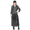 Ce costume comprend une veste, un haut et une jupe et est conçu pour recréer l'uniforme scolaire de l'iconique personnage. La veste, dans des tons de gris, arbore l'écusson de la Nevermore Academy, l'école fréquentée par Mercredi Addams. Elle se ferme avec des boutons et on y retrouve de petites poches sur les côtés pour plus de praticité. Le déguisement inclut également un haut gris avec un col blanc et une cravate noire, complétant l'ensemble de manière élégante. La jupe, assortie à la veste, est longue et conserve les mêmes teintes grisées.
