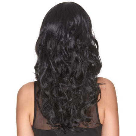 Cette perruque luxe cheveux longs ondulés avec frange en cheveux synthétiques noirs avec un tour de tête élastiqué pour le maintien.